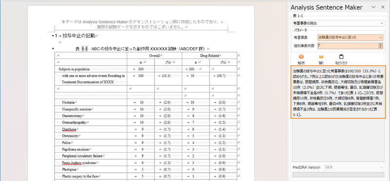選択された帳票を瞬時に解析し、モデルとパラメータに基づき定型文を自動生成します。帳票の脚注にMedDRAバージョンの記載がある場合、記載されているMedDRAバージョンを用いて英語から日本語へ変換が行われます。