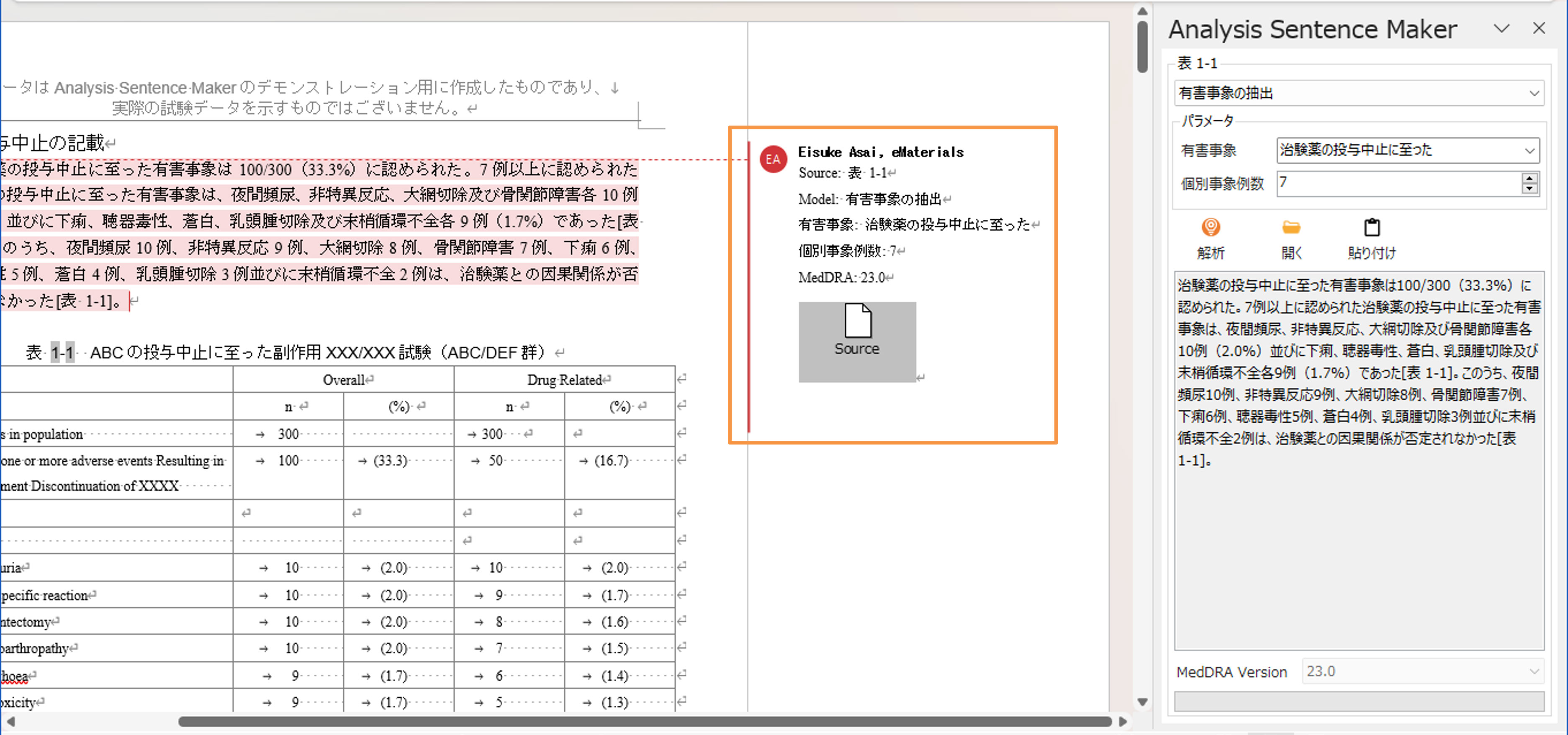 定型文を貼り付けた際、証跡(利用したモデルやパラメータなど)がWordのコメントとして記録されます。この証跡は、第3者QCなどで利用が可能です。