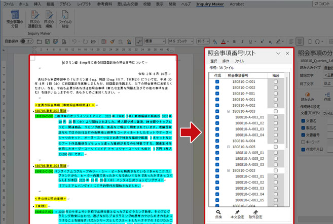 Inquiry Makerを利用して、照会事項番号や質問事項を読み込み(蛍光ペン箇所)、自動的にリストアップします。