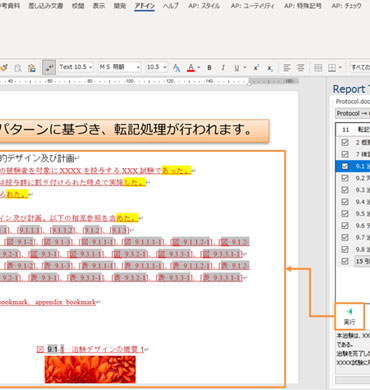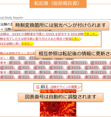 製薬業界における転記作業は、計画書の計画部分を報告書へ転記したり試験報告書の一部を申請資料へ転記するなど、様々な場面で転記の作業が必要となります。転記作業は文書をただ単に転記するだけでなく、文書内に含まれる見出し番号や図表番号の調整、リンク情報の更新、使われている言葉の時制を変更するなど付帯する作業が多く、これらの作業はWordの機能を用いて人力で行うため、当該作業に多くの時間を費やしたり、作業自体が属人的になりがちです。