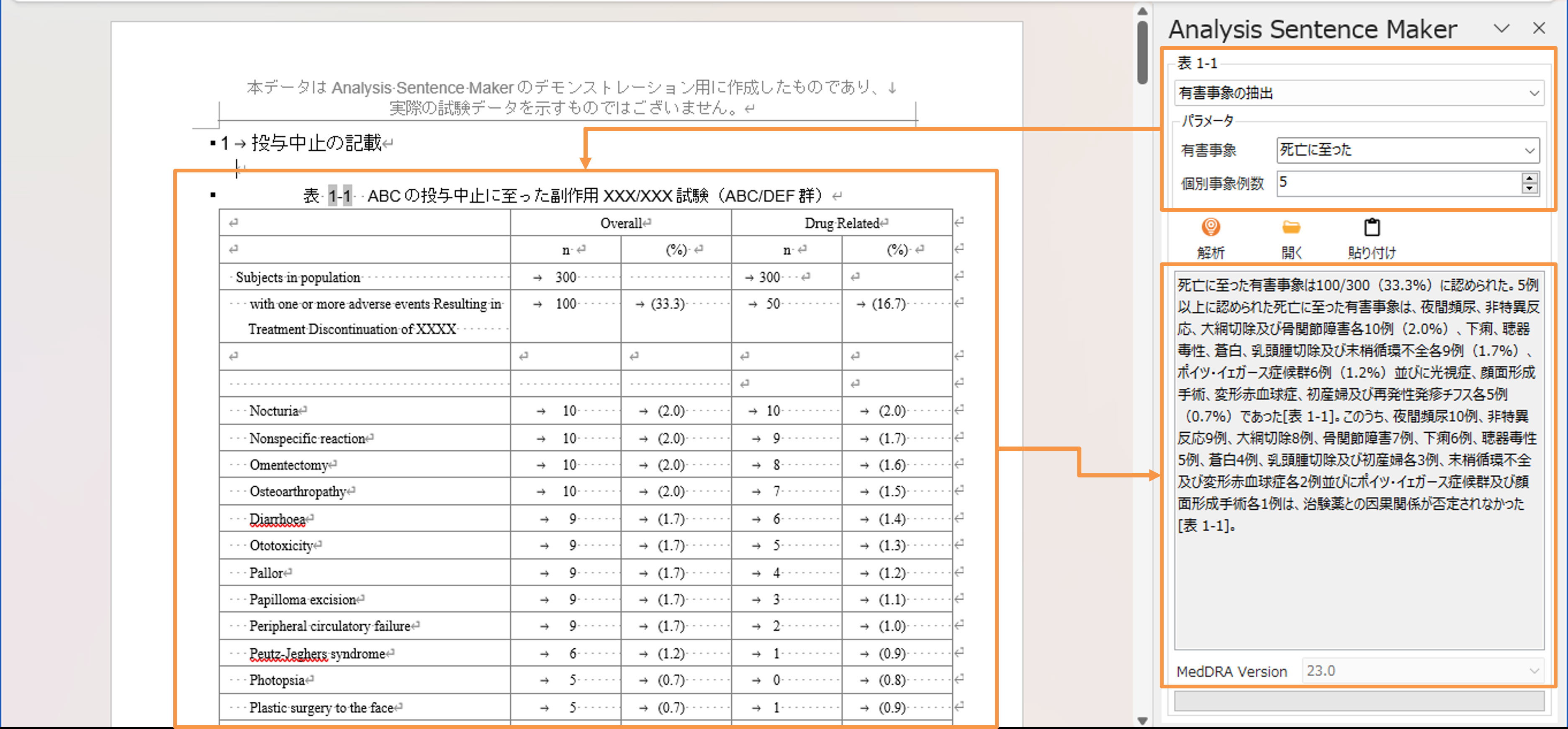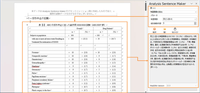 選択された帳票を瞬時に解析し、モデルとパラメータに基づき定型文を自動生成します。帳票の脚注にMedDRAバージョンの記載がある場合、記載されているMedDRAバージョンを用いて英語から日本語へ変換が行われます。
