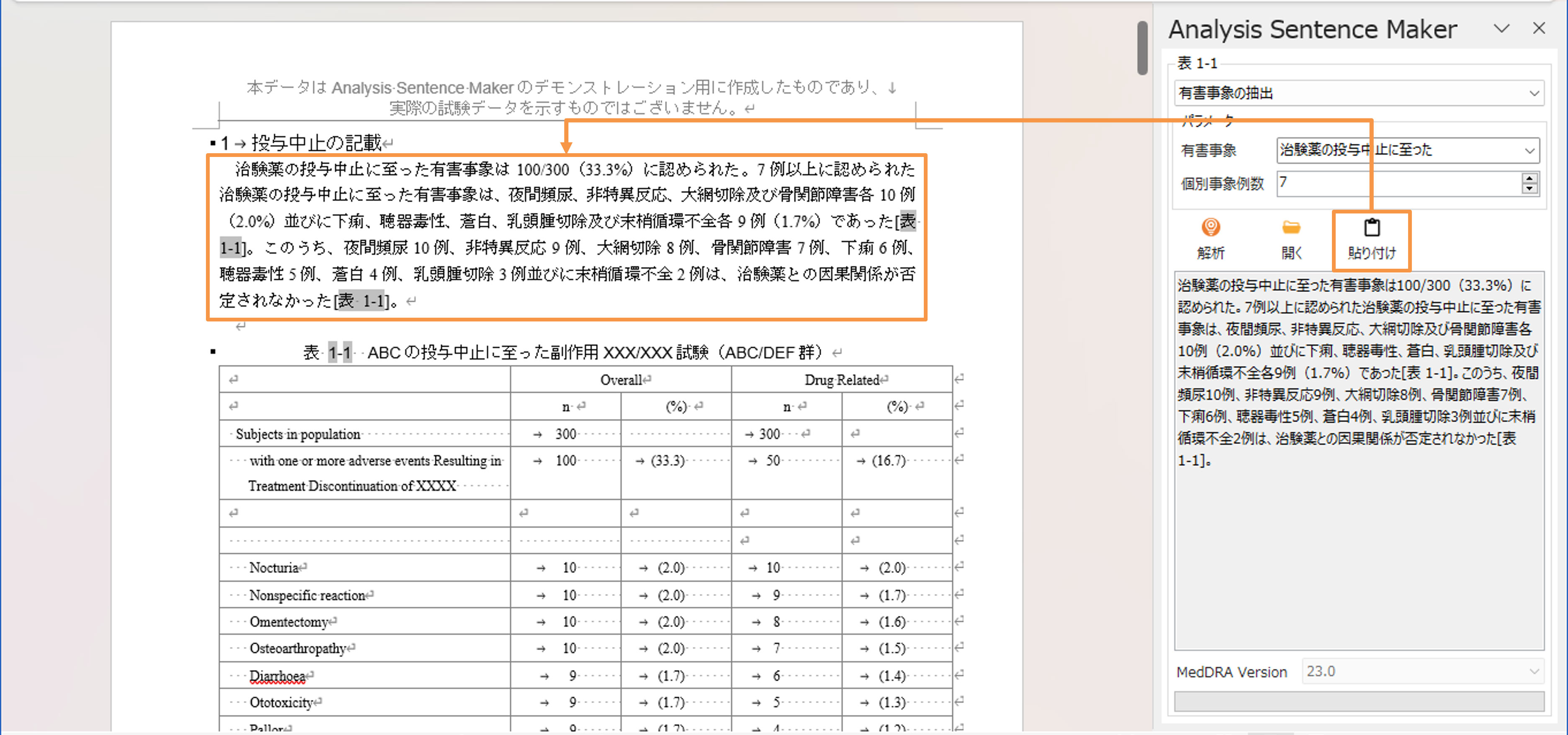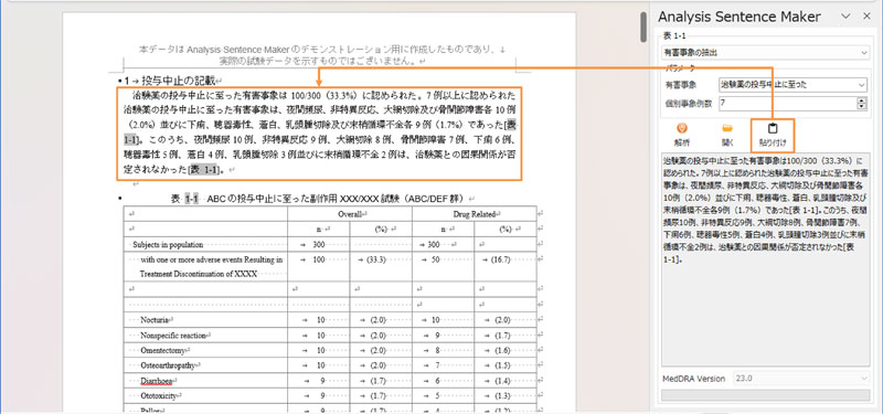 プレビューの定型文を本文へ貼り付けることができます。また、解析した帳票の表番号に対する相互参照(リンク)も貼り付けと同時に設定することが可能です。