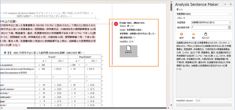 定型文を貼り付けた際、証跡(利用したモデルやパラメータなど)がWordのコメントとして記録されます。この証跡は、第3者QCなどで利用が可能です。