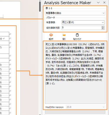 文章作成の作業は上述の分析が伴うため、熟練度が必要であり、文章作成の御作法(有害事象の記載順や重複した事象例数が存在する有害事象の記載方法など)も多く、これらは手作業で行うため、当該作業に多くの時間を費やしたり、作業自体が属人的になりがちとなります。