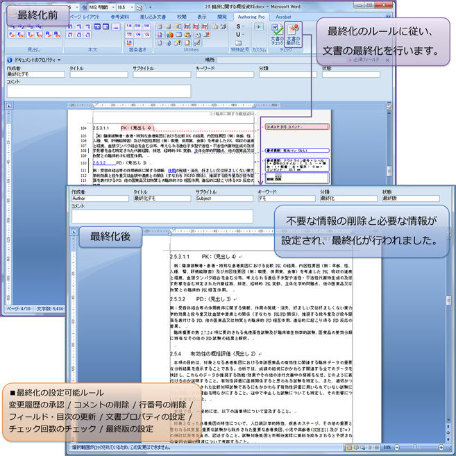文書の最終化機能を利用して、あらかじめ定めた最終化ルールに従い文書の最終化が行えます。最終化機能を利用することにより、文書作成の最後に必ず行うような作業を自動化し、最終処理の作業漏れを防ぐことが可能です。