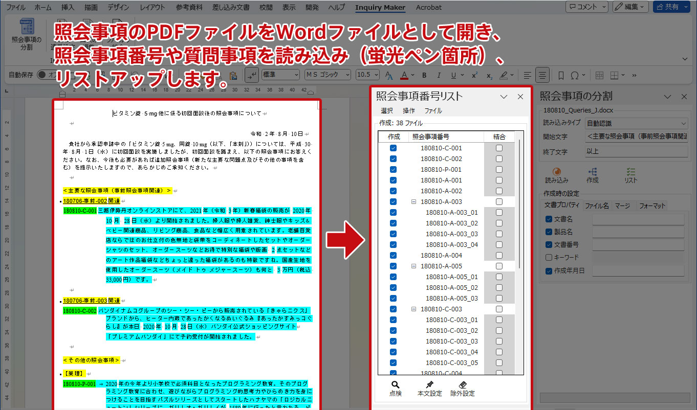 Inquiry Makerを利用して、照会事項番号や質問事項を読み込み(蛍光ペン箇所)、自動的にリストアップします。