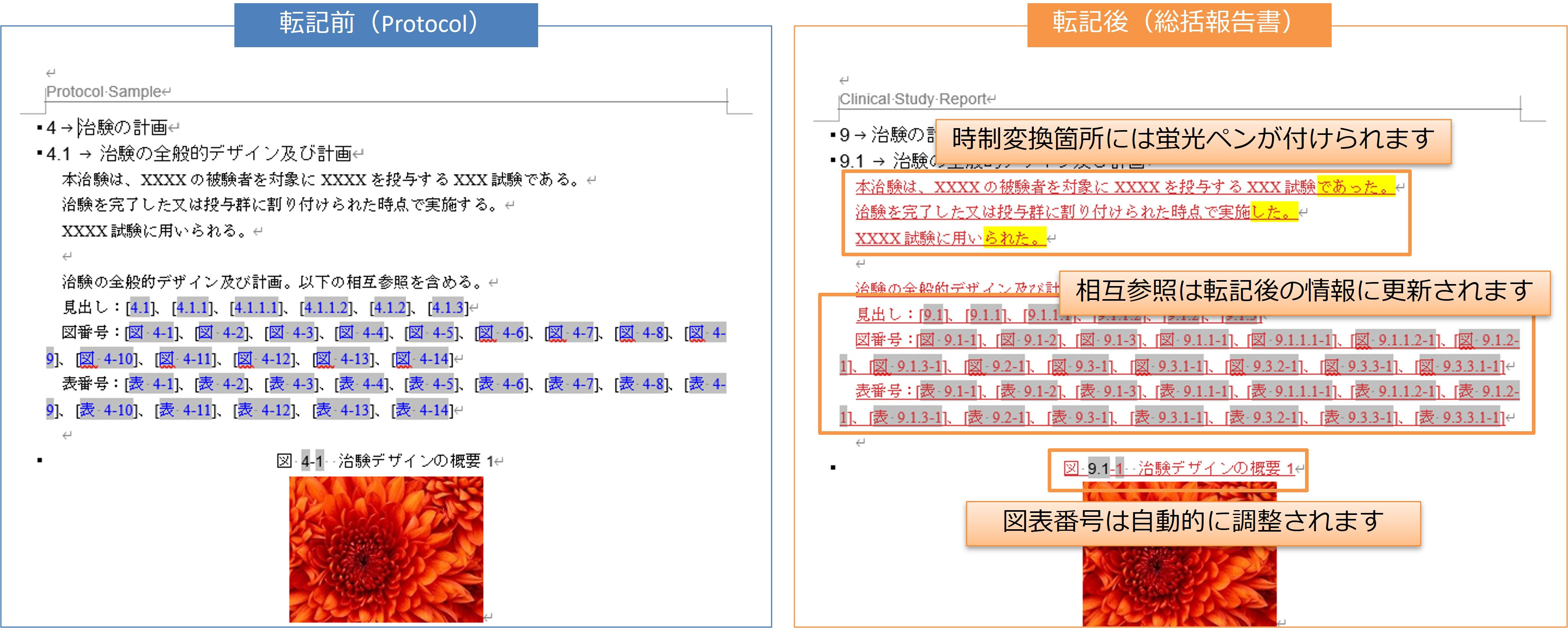 転記処理により、リンク情報や図表番号の更新、使われている言葉の時制を変更するなど、